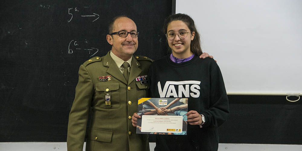 La alumna de 1º de Bachillerato recibió el diploma acreditativo de manos del capitán Jesús Pina en presencia de sus compañeros de clase, que la premiaron con un fuerte aplauso.