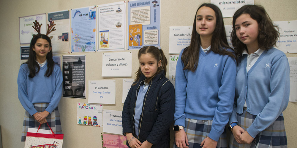Si hace unos días eran Valeria y Paula quienes entregaban los premios del concurso de microrrelatos que había organizado, esta mañana fue el turno de Lía Arjona, Adriana Viego y Paula Hontoria, de 6º A, quienes hicieron lo propio con los galardones del certamen de eslóganes y dibujos que dedicaron a sus compañeros de 2º de Ed. Primaria. La entrega tuvo lugar en la biblioteca del Colegio, que ya luve los trabajos ganadores.