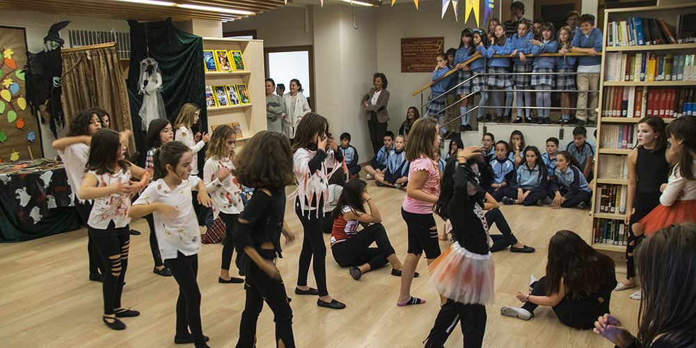 La cita era en la biblioteca del Colegio, en horario de tarde. Por turnos, los alumnos de 2º a 6º de Educación Primaria fueron saliendo de sus clases y encaminándose hacia el punto de encuentro. A medida que se fueron aproximando, los comentarios y las risas que suelen acompañar estos recorridos de un lugar al otro del Colegio fueron cesando. Al fondo del pasillo sólo se divisaba oscuridad. Guiados por sus profesores, los niños se atrevieron a franquear la puerta. Les recibió una espesa niebla que apenas les permitió adivinar las telarañas, esqueletos y murciélagos que se habían apoderado de la biblioteca. Pero éstos no eran los únicos seres que les esperaban: un pasillo de momias, vampiros, brujas y zombis les fue recibiendo. ¿Quiénes eran? ¿De dónde había salido? El misterio finalizó una vez se encendieron las luces y los alumnos pudieron ver a las bailarinas del taller de Baile Moderno caracterizadas para la ocasión. A continuación, el grupo interpretó una coreografía con música de los Backstreet Boys que encantó a alumnos y profesores.