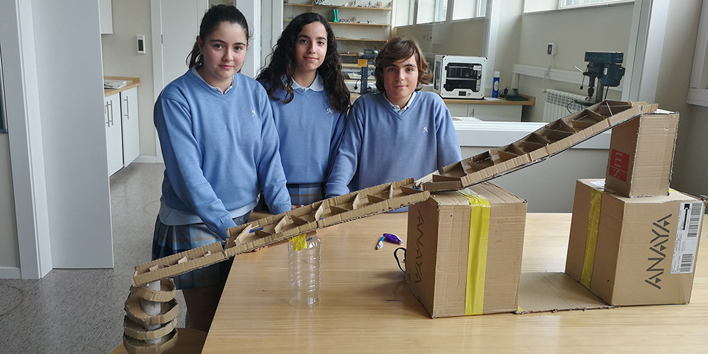 Todo un desafío. Los alumnos de 2º de ESO han desarrollado en la asignatura de Tecnología unas estructuras que debían cumplir las siguientes condiciones: soportar 1kg de peso y sostener dos rampas, una longitudinal y otra espiral, por las que se desplaza una canica en un tiempo que supere los 30 segundos.
