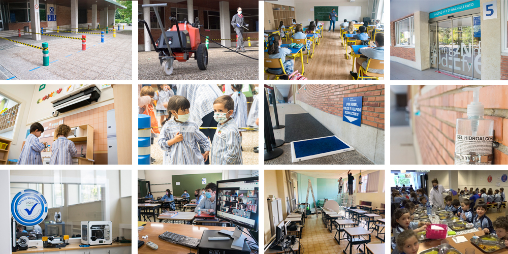 De forma paralela al Plan de Contingencia, durante las semanas previas al inicio del curso el Colegio planificó y se fue preparando para el comienzo de las clases. Se diseñaron entradas y salidas escalonadas por diferentes puertas y horarios en función de los diferentes niveles; se organizaron diferentes horarios de recreo en función de los distintos niveles y grupos estables de convivencia; se avanzó en la señalética tanto en la cuesta de acceso y exteriores del centro como en los pasillos interiores y patios del centro; se prepararon las aulas que ya funcionaban y se acondicionaron espacios nuevos (antigua biblioteca, Science Lab, aulas de Tecnología, aula Audiovisual, laboratorios…) para que todos los alumnos pudieran asistir a clase cumpliendo las distancias de seguridad; se planificó la enseñanza semipresencial en 3º y 4º de ESO y Bachillerato (dada la falta de espacio para cumplir con las distancias), etc. En Bachillerato hemos corregido esta situación recientemente ampliando las aulas existentes, derribando tabiques y levantando otros en espacios ubicados entre estas aulas. Esto ha permitido el regreso de todos los alumnos a una enseñanza cien por cien presencial. No obstante, las cámaras con que se había dotado a estas clases se están utilizando para ofrecer las sesiones de manera online a aquellos alumnos que no pueden acudir al centro por cualquier circunstancia.