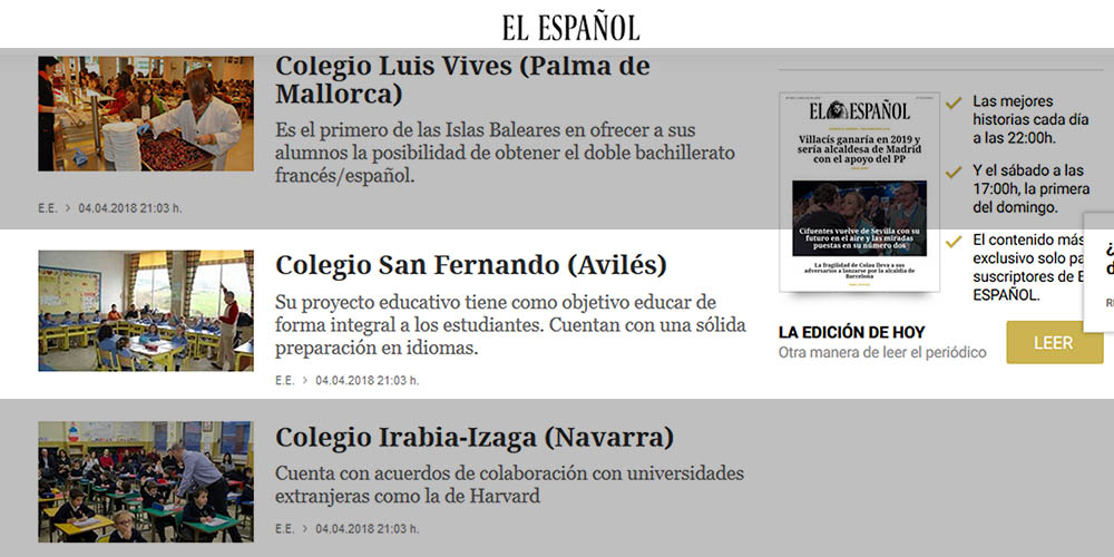 El diario digital 'El Español' ha incluido al Colegio San Fernando en su clasificación de los cien mejores centros educativos del país. Se trata de una guía con la que este medio quiere ayudar a los padres a tomar la mejor decisión para la educación de sus hijos de cara al curso 2018-2019.
