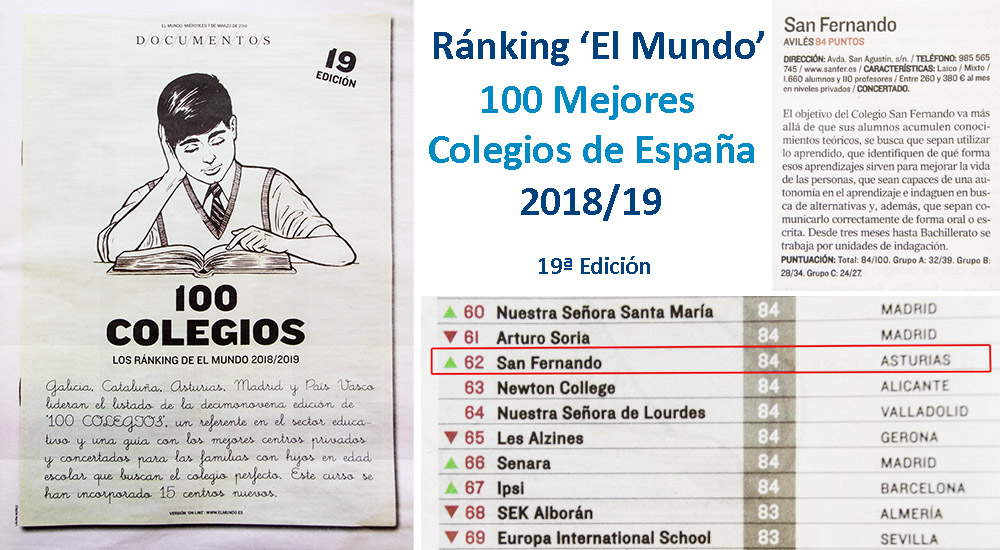 El esfuerzo del Colegio San Fernando por ofrecer la mejor calidad en la enseñanza a sus alumnos ha sido reconocido con su inclusión en una nueva edición del ránking de 'Los 100 Mejores Colegios' de España privados y concertados. Esta clasificación, que elabora el periódico 'El Mundo', cumple su 19ª edición informando a los padres sobre las características de los diferentes centros de cara al próximo curso.