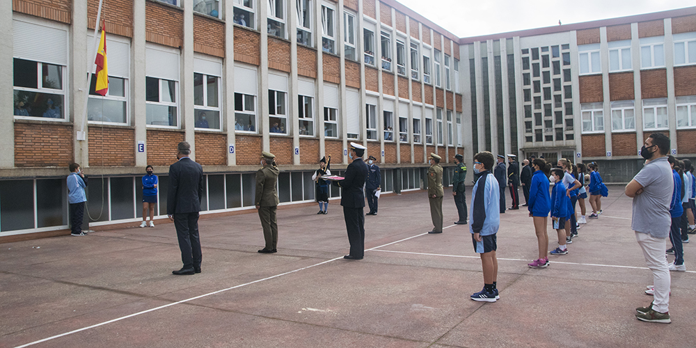 El 9 de octubre, unos días antes de su celebración oficial, el Colegio celebró el Día de la Hispanidad con un acto de izada de bandera muy especial. La cita, organizada con todas las medidas de prevención y seguridad frente a la COVID-19, contó con la presencia, entre otros, del Teniente Coronel D. José Ángel Hevia, el Comandante D. Jesús María Pina, los Brigadas D. Antonio Trobajo y D. José M. Pérez, el Sargento Reservista Voluntario D. Javier Mencía y el Cabo Primero de la Armada D. Vicente Queiruga, además de miembros de la Guardia Civil.