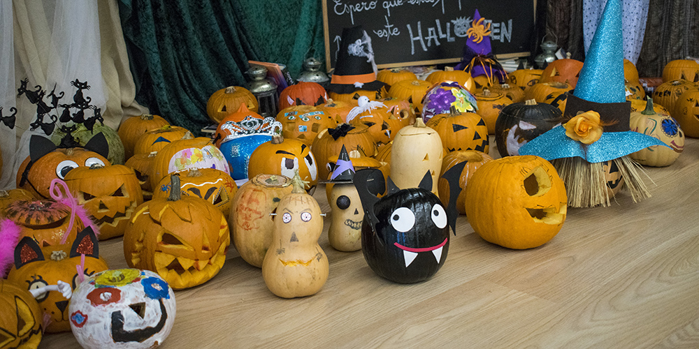 Terroríficas, graciosas, románticas, infantiles... Decenas de calabazas diseñadas de diferentes maneras ocupan estos días la biblioteca del Colegio, proporcionándole un aspecto tan 'inquietante' como divertido. La razón de esta invasión hortícola es la propuesta de nuestra bibliotecaria, Esperanza Gallego, a nuestros alumnos para que la ayudasen a decorar este espacio con motivo de Halloween. La respuesta ha sido abrumadora, y durante estos días no han dejado de llegar nuevas calabazas que se suman a la colección. No es de extrañar que la biblioteca se haya convertido en uno de los puntos más visitados el Colegio, y no solo por los amantes de la lectura.